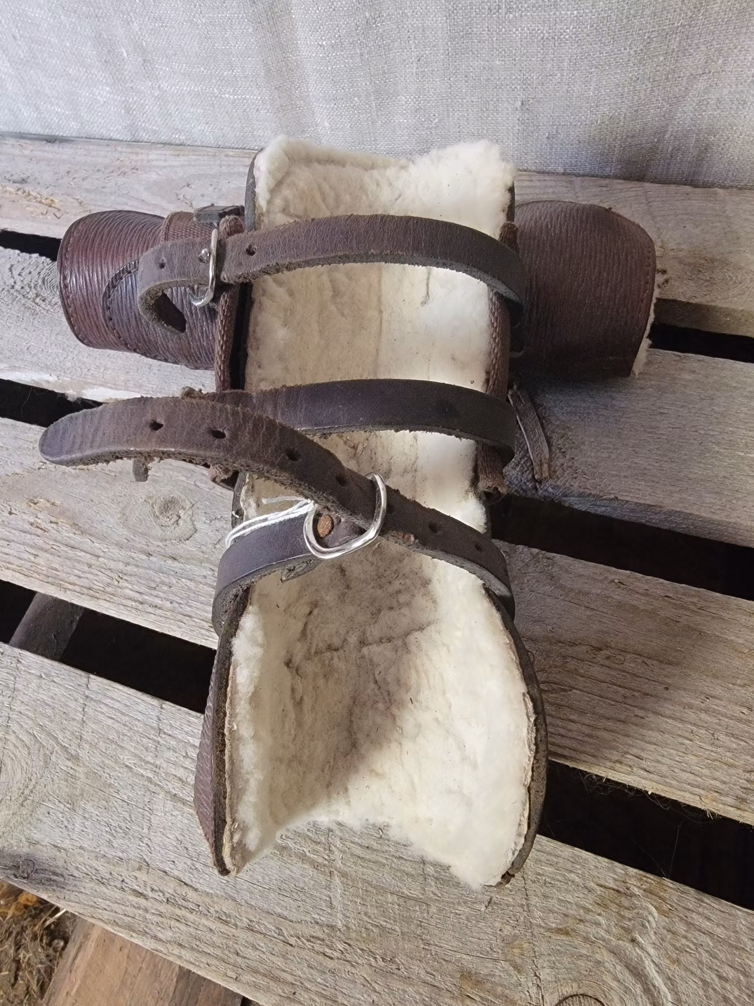 Läderbenskydd fårskinnsklädda stl M/L ? 23 cm höga 80 kr I lager. Lägg i korgen Produktbeskrivning Ytterst lite smuts finns men övrigt fint skick.