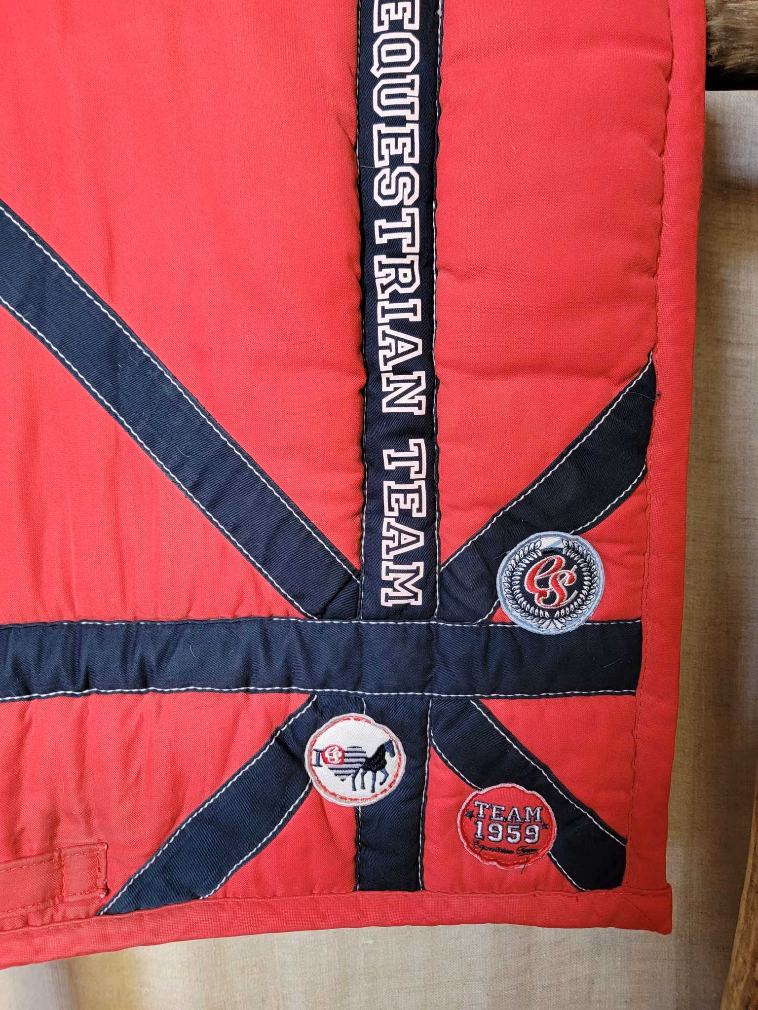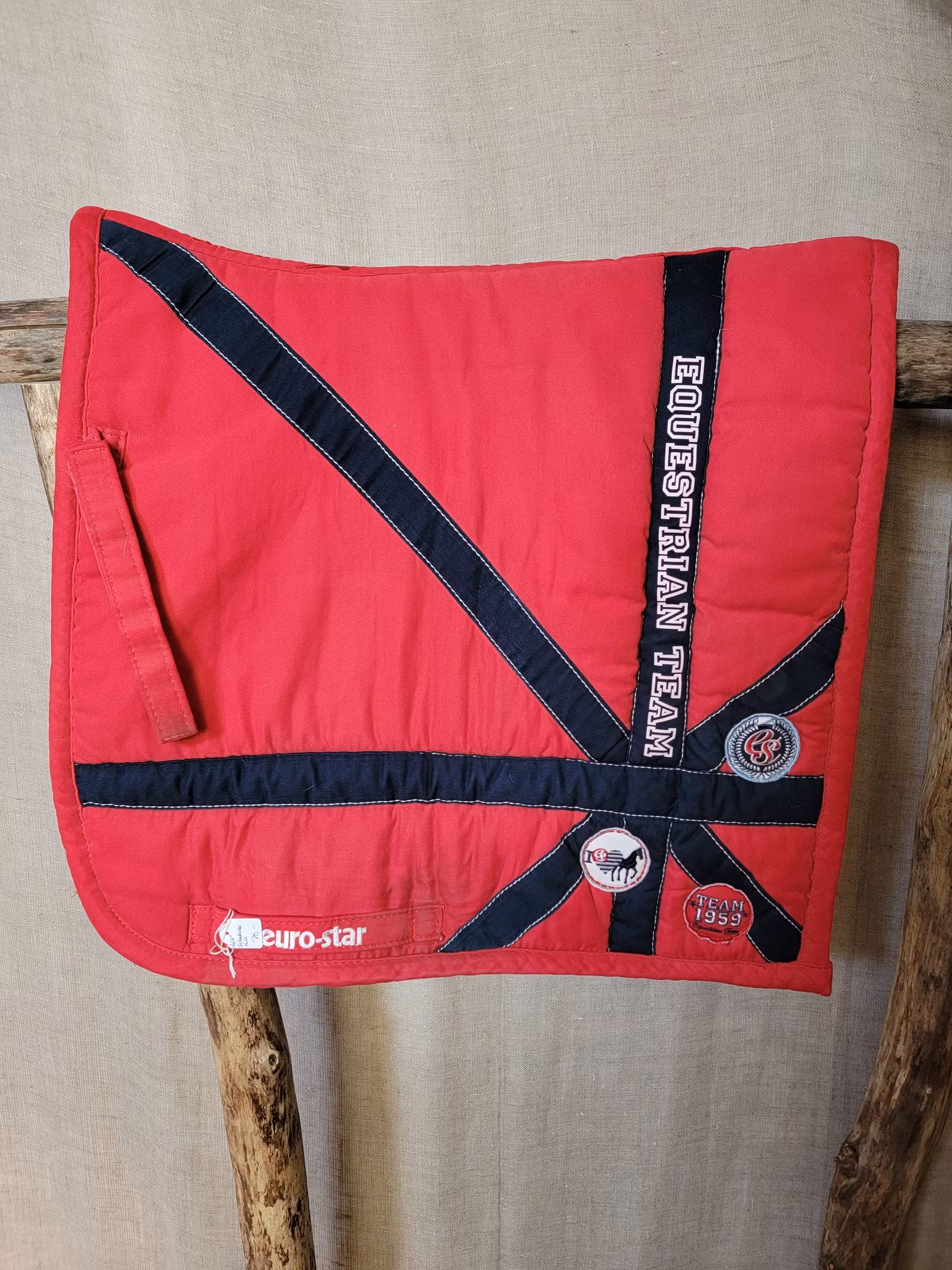 Dressyrschabrak stl full från Euro-star i rött och blått 70 kr I lager. Lägg i korgen Produktbeskrivning Lite fläckar vid sadelgjordsfästet och hår finns på undersidan men annars ok tvättat skick.