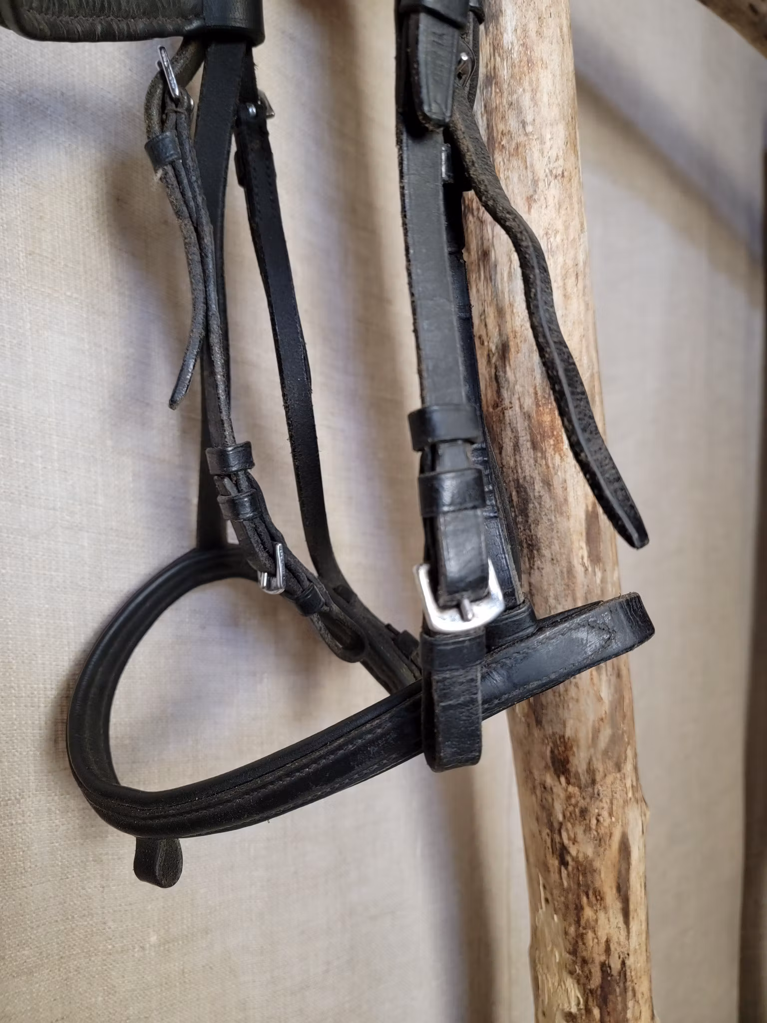 Träns stl Shetland i svart med silverspännen 60 kr I lager. Lägg i korgen Produktbeskrivning Lite slitage och smuts finns, har varit sytt något på pannbandet men övrigt ok skick.