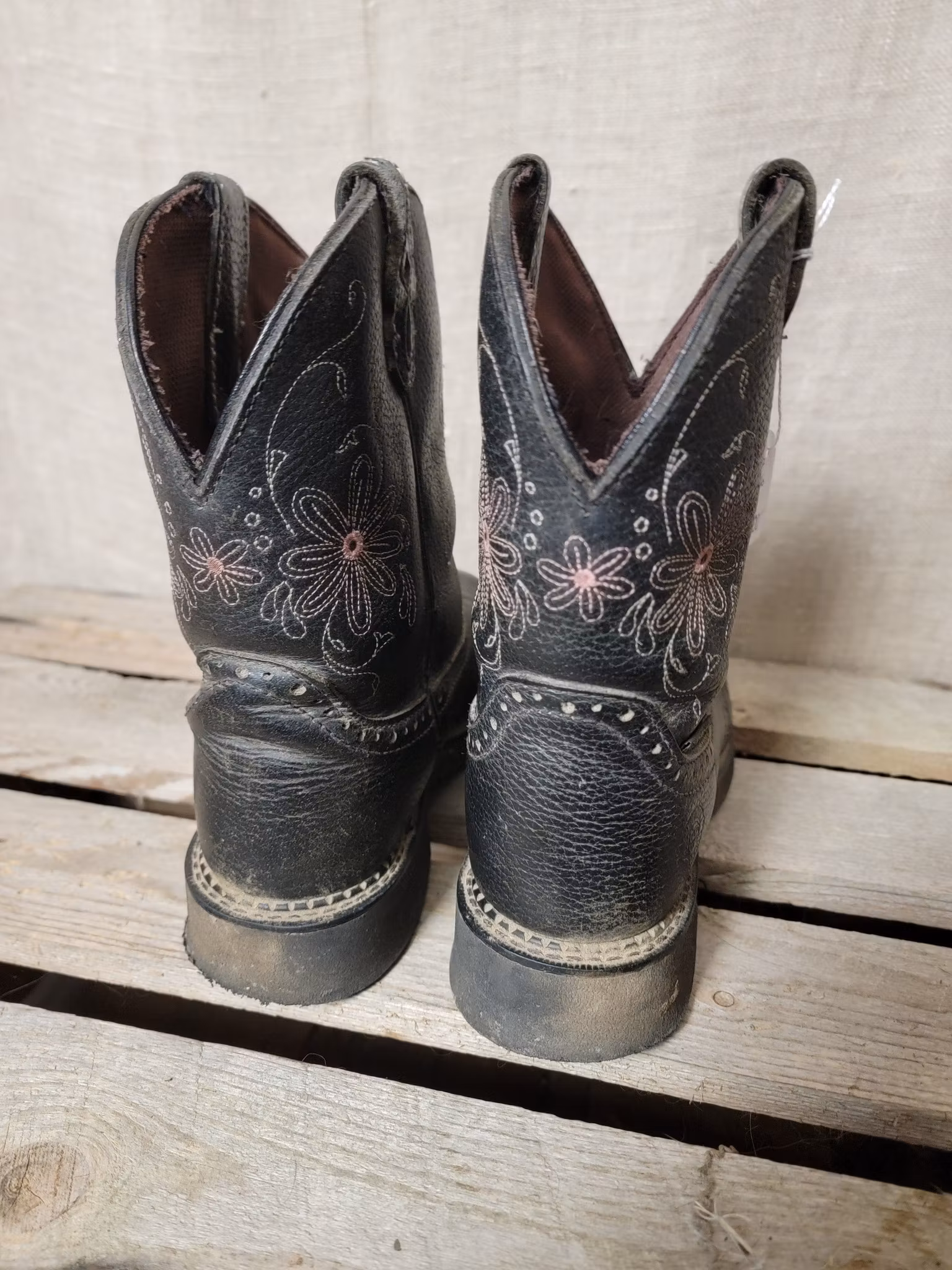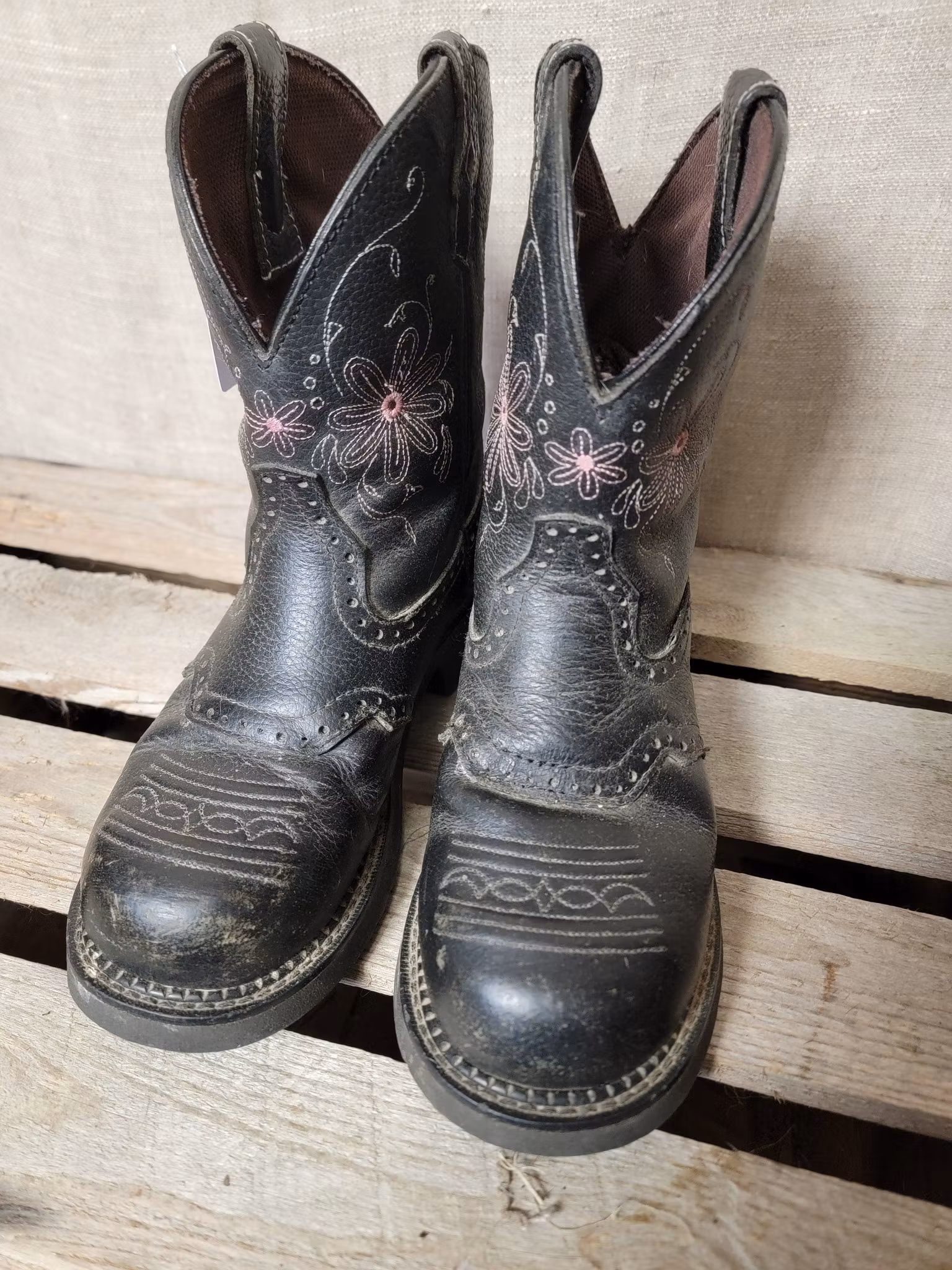 Westernboots stl 6,5 med stålhätta i svart med rosa detaljer från Justin 700 kr I lager. Lägg i korgen Produktbeskrivning Lite slitage och smuts finns men övrigt ok skick.