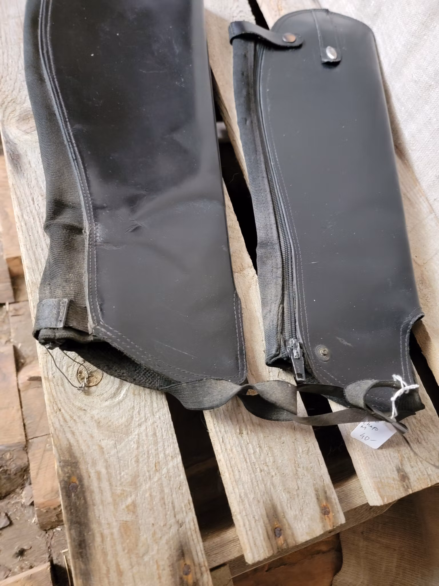 Skinnchaps i svart stl M från Busato 40 kr I lager. Lägg i korgen Produktbeskrivning Lite slitage och smuts finns och ena flärpen saknas på dragkedjan men övrigt ok skick.