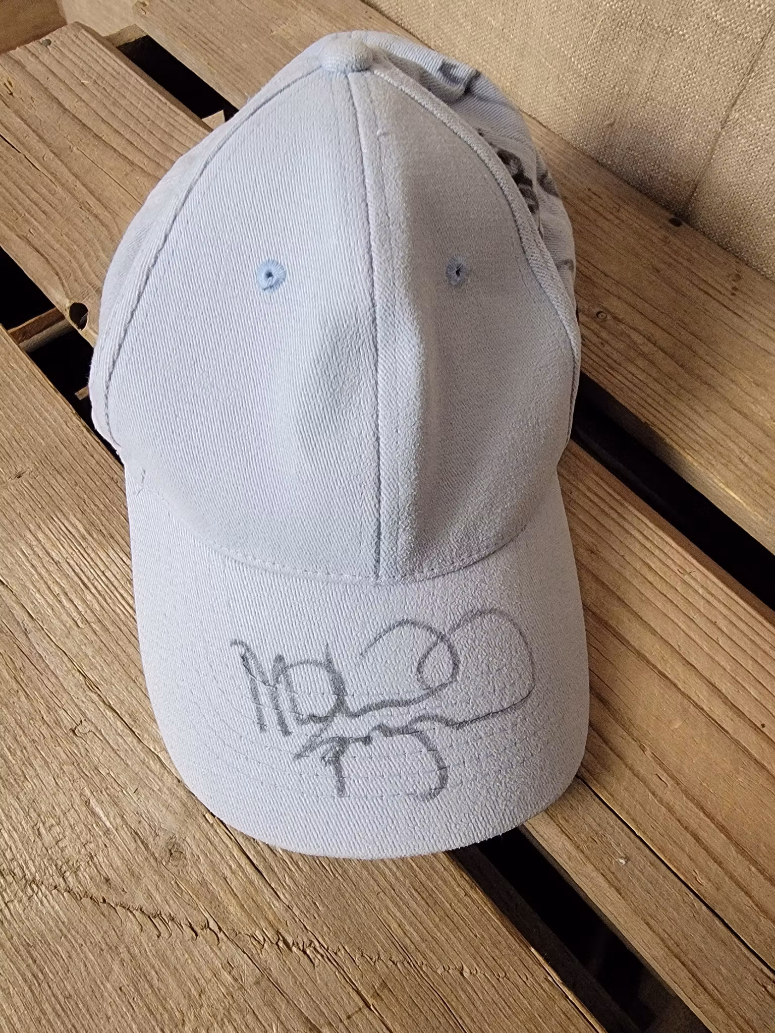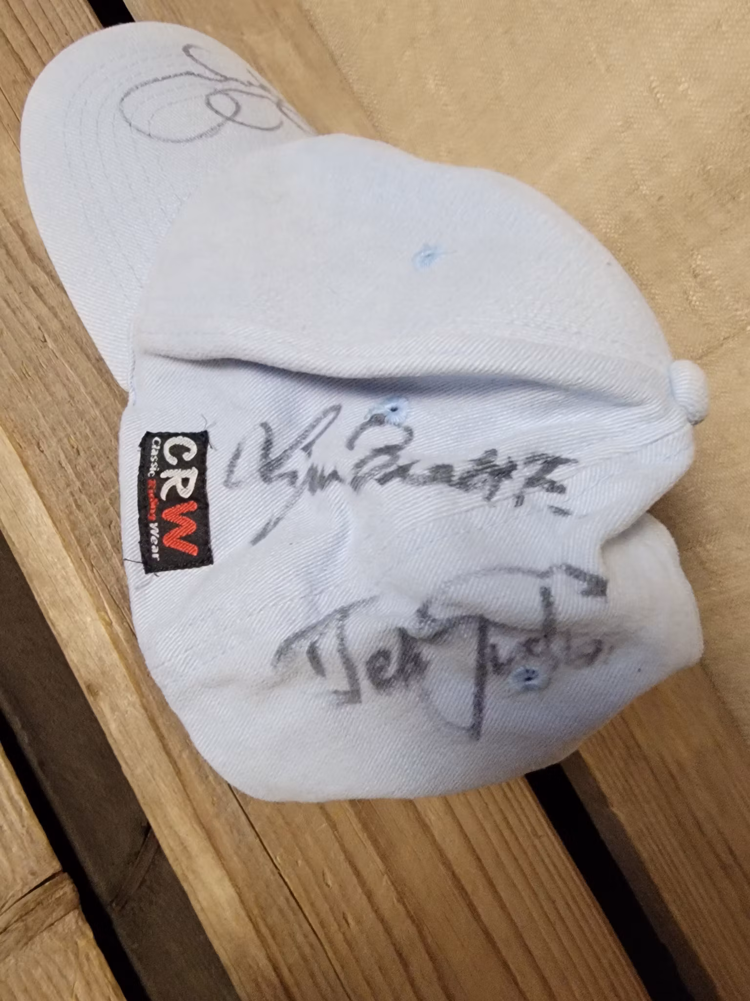 Keps i ljusblått med autografer från CRW