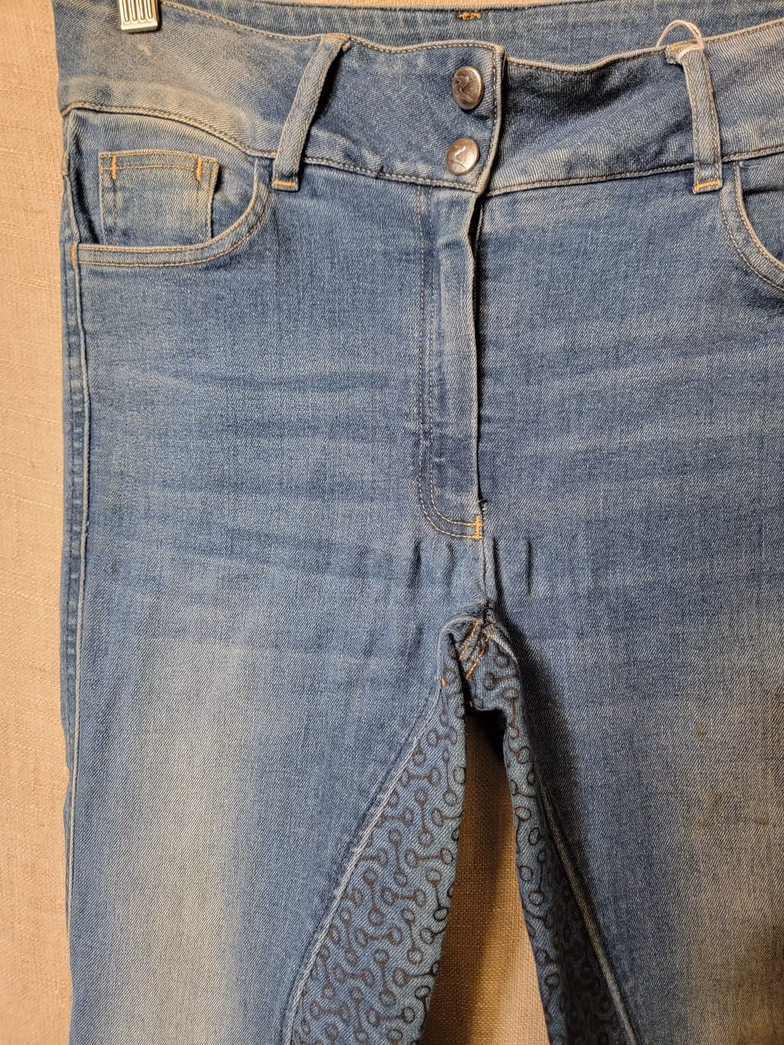 Ridbyxa silikonskodda stl 38 från Horze i jeanstyg 20 kr I lager. Lägg i korgen Produktbeskrivning Lite släpp av stretchen vid grenen och några småfläckar finns men övrigt ok skick.