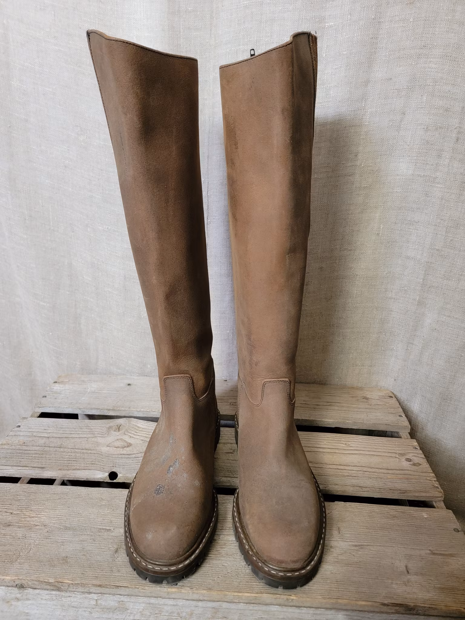 Ridstövlar stl 41 från Rectiligne 47 cm höga baktill och 39 cm omkrets vad 160 kr I lager. Lägg i korgen Produktbeskrivning Finns något som droppats på ena stöveln ev. vax ? Annars fint skick