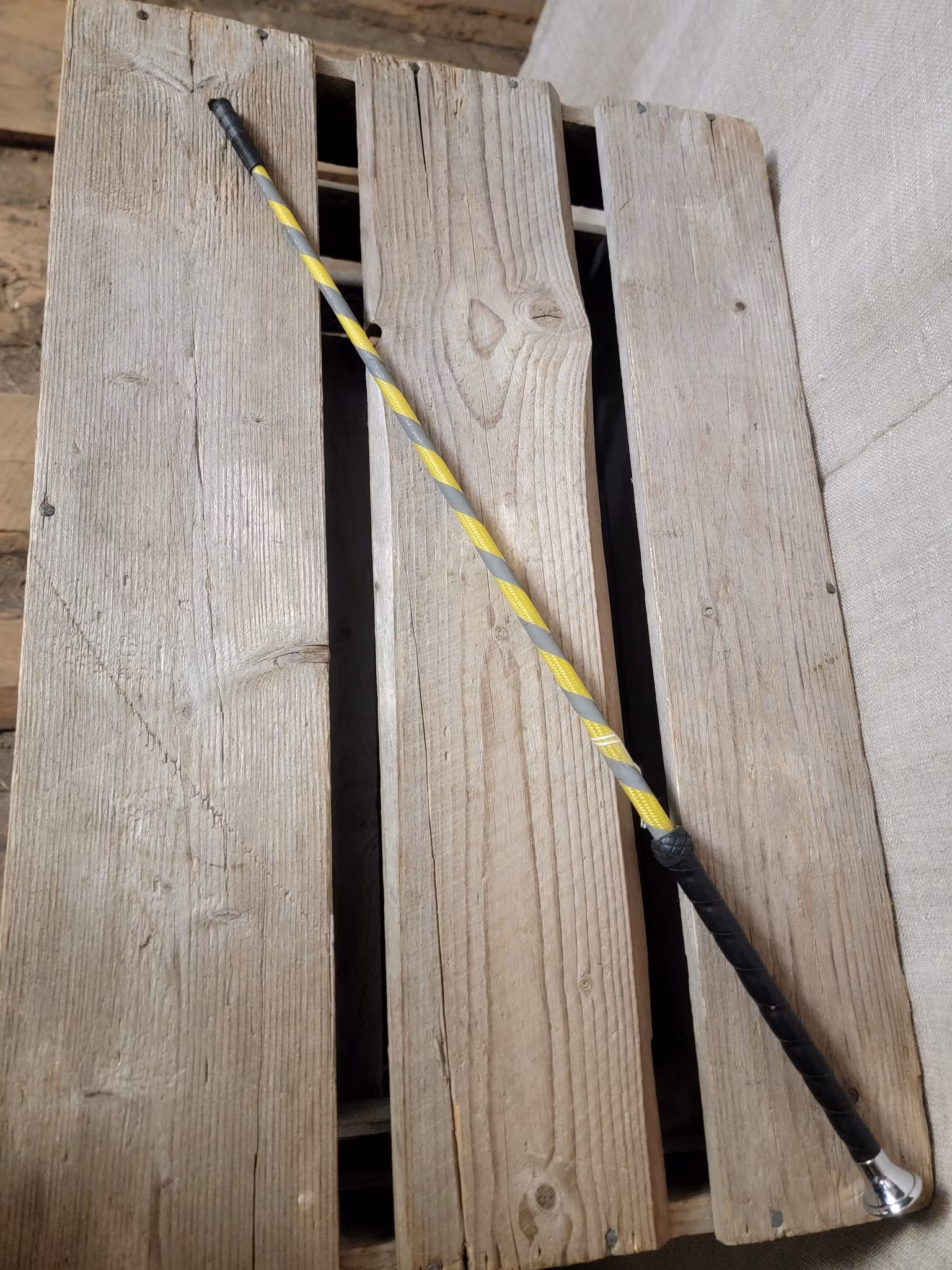 Dressyrspö i gult med reflexdetaljer 20 kr I lager. Lägg i korgen Produktbeskrivning Snärten har gått av men övrigt ok skick.